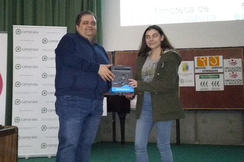 David Garrido, director de la Filmoteca de Extremadura, hace entrega del premio valorado en 60€ patrocinado por Camaralia.