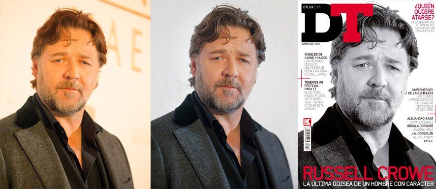Una revista le encarga que, de un posado promocional de Russell Crowe, intente sacar un retrato “robado” para la portada y así no tener que pagar por los derechos de imagen del actor. “La dificultad de un photocall reside en que todo transcurre muy rápido. Coger el gesto de los asistentes a veces es difícil, aún más cuando te encargan un rostro muy definido para la portada”. Durante los pocos segundos en los que el actor permanece posando ante los medios de comunicación, Jesús, equipado con una cámara 5D Mark II, dispara una ráfaga de más de 35 fotos intentando así que, al menos una de las tomas, haya captado la mirada directa del personaje al objetivo. Una vez visionadas las fotos, se selecciona la más apropiada para la portada. Se realiza una corrección de la temperatura de color, se “limpia” la piel y se elimina el fondo, todo con Adobe Photoshop, anulando la publicidad que siempre llevan las traseras. Finalmente se obtiene una foto para maquetación en blanco y negro, tal y como demanda el cliente. La maquetación se realiza con Adobe Indesign, donde se diseña la portada definitiva.