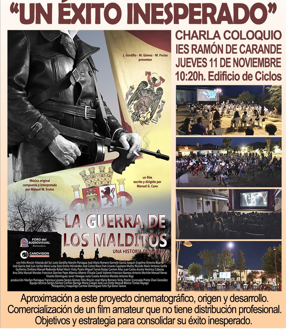 Charla coloquio con los alumnos del Grado Superior del Ciclo de Marketing y Publicidad del IES Ramón Carande de Jerez de los Caballeros. Debatimos la experiencia que ha supuesto "el éxito" inesperado del film "La Guerra de los Malditos". Distribución y comercialización en salas culturales, la difusión y el posicionamiento. Objetivos y estrategia...